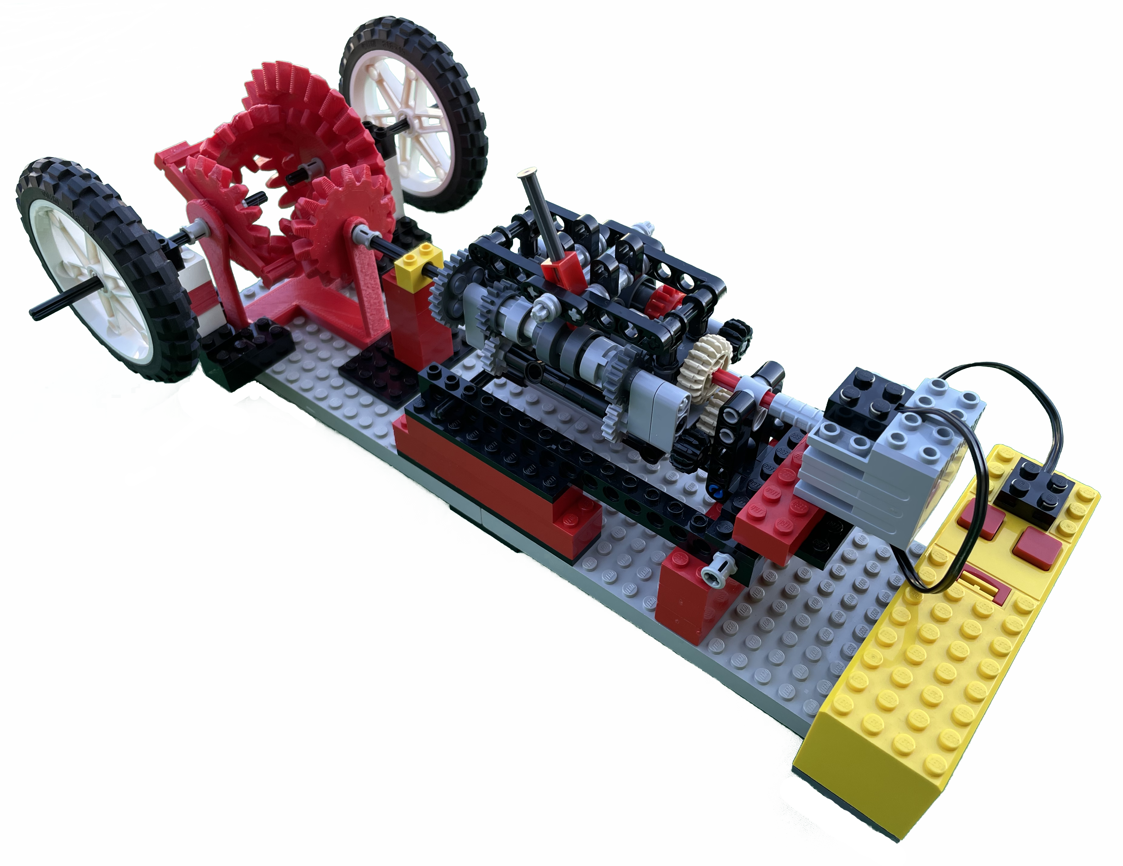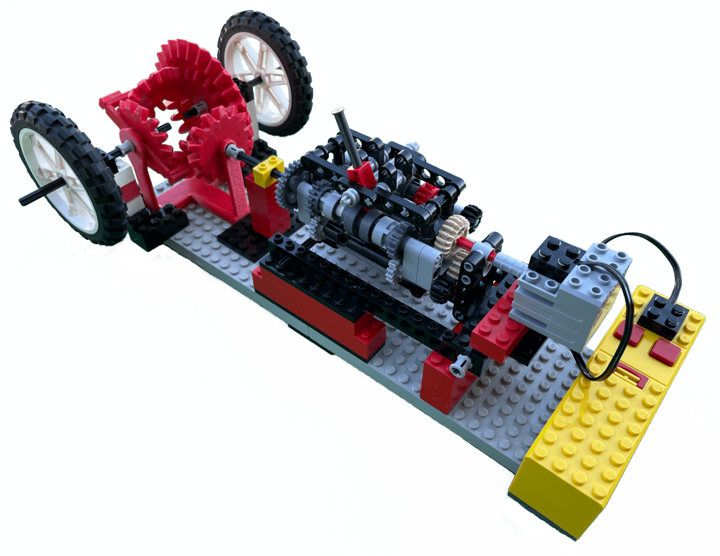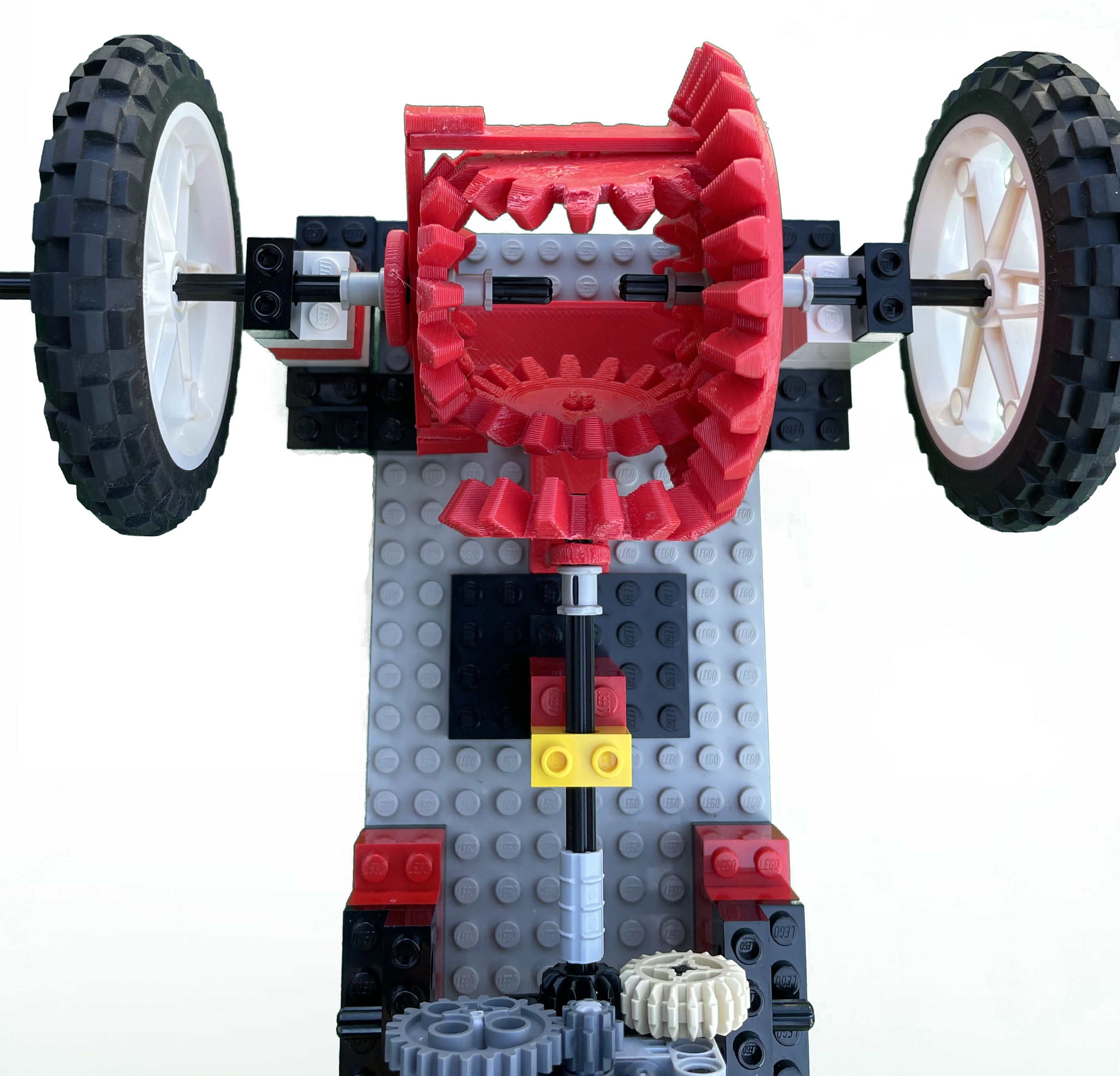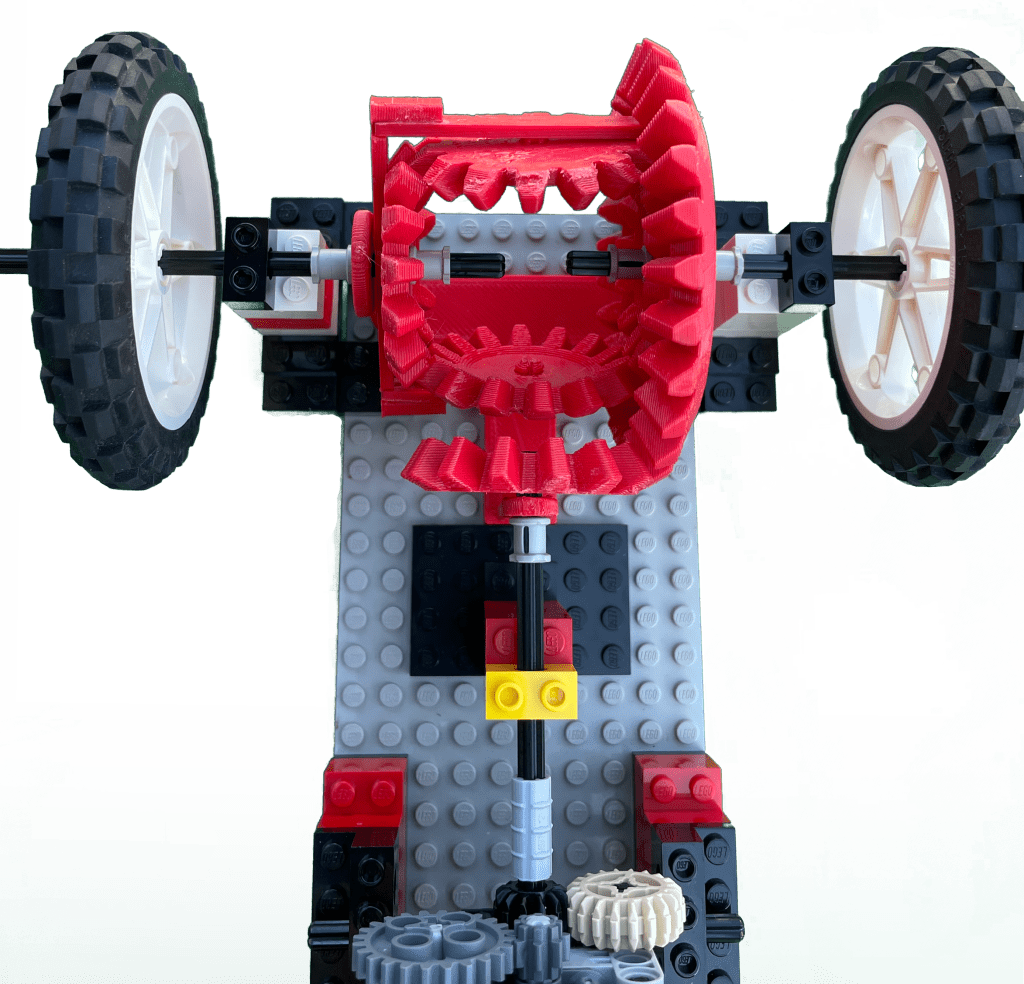 In my Engineering class we were tasked with designing lego pieces in CAD. Most of my class was learning CAD for the first time, but I have years of experience. Therefore, I needed to make something cool. This differential snaps onto a lego plate at the bottom, and all the gears connect with lego axles. My dad put together a lego 6 speed transmission designed by David Gustafsson. The yellow battery powers the motor above it, the power is controlled by the transmission in the middle, and the red differential transfers the power to the wheels.