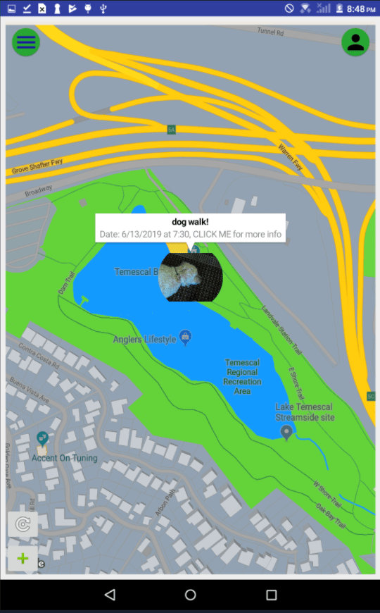 When you open the app, the main page is entirely taken up by a map. This was the main focus of the app. On this map, you see pins at every location where you or a friend is planning an event. The pins are identifiable by the creator’s profile picture in the pin. There are buttons in the corners to access you profile, manage your friend connections, and create your own events.